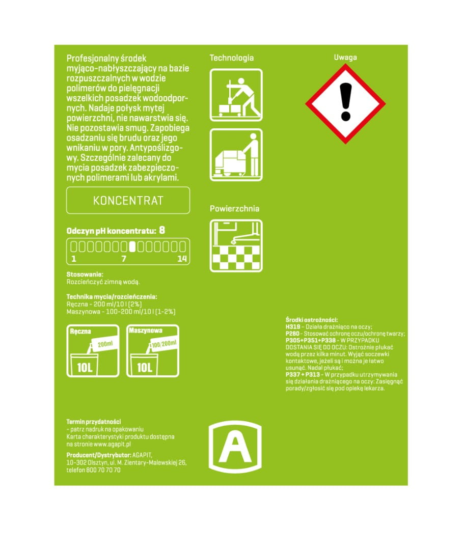 Profesjonalny preparat przeznaczony do pielęgnacji wszelkich posadzek wodoodpornych, szczególnie zalecany do mycia posadzek zabezpieczonych warstwami polimerowymi oraz akrylowymi. Środek bazujący na rozpuszczalnych w wodzie polimerach. Posiada właściwości nabłyszczające, dzięki czemu na mytej powierzchni pozostawia połysk oraz ochronną warstwę, zapobiegającą osadzaniu się brudu. Preparat nie pozostawia smug, nie nawarstwia się, antypoślizgowy. Odpowiedni zarówno do ręcznej jaki i maszynowej techniki zmywania. Produkt w postaci koncentratu zapewnia wysoką wydajność.
