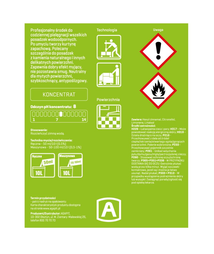Profesjonalny preparat o uniwersalnym zastosowaniu. Przeznaczony do mycia i pielęgnacji wszelkich posadzek wodoodpornych. Środek neutralny, bezpieczny dla mytych powierzchni. Polecany szczególnie do delikatnych powierzchni jak np. posadzki z kamienia naturalnego. Najważniejszą zaletą produktu jest jego niezawodność, zapewnia bardzo dobry efekt myjący. Dodatkowo środek po umyciu tworzy długotrwałą kurtynę zapachową. Nie pozostawia warstw oraz smug. Posiada właściwości szybkoschnące i antypoślizgowe. Odpowiedni do zmywania techniką ręczną i maszynową.